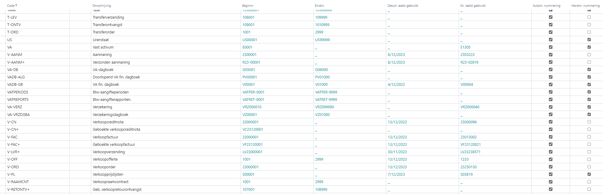 Overloop alle nummerreeksen waarbij iets is ingevuld in de kolom 'Nr. laatst gebruikt'.