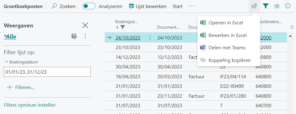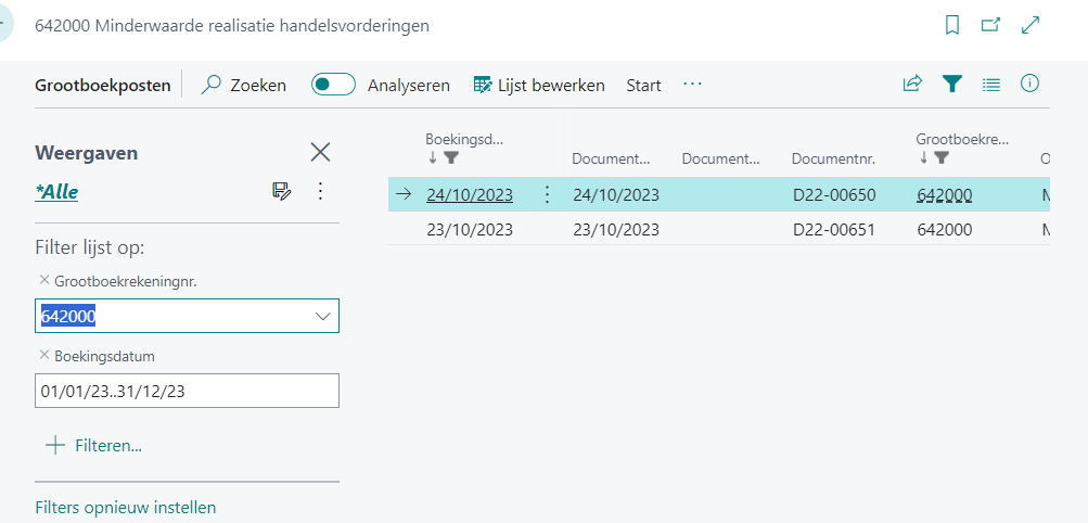 Door nu de filter te schrappen op de grootboekrekeningnr. krijg je de posten van alle rekeningen.