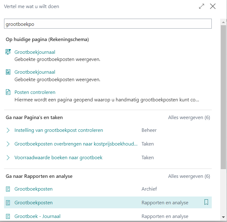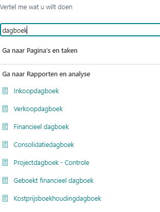 Als je zoekt op 'Dagboek' krijg je onderstaande lijst bij Rapporten en analyse
