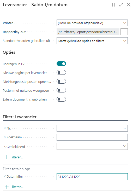 Idem voor de leveranciers met het rapport 'Leverancier - saldo t/m datum' maar hier heb je niet de mogelijkheid een einddatum in te geven.