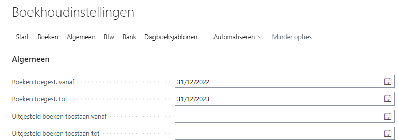 - Controleer de boekhoudinstellingen en pas eventueel de datums aan bij 'Boeken toegest. vanaf' en 'Boeken toegest. tot':