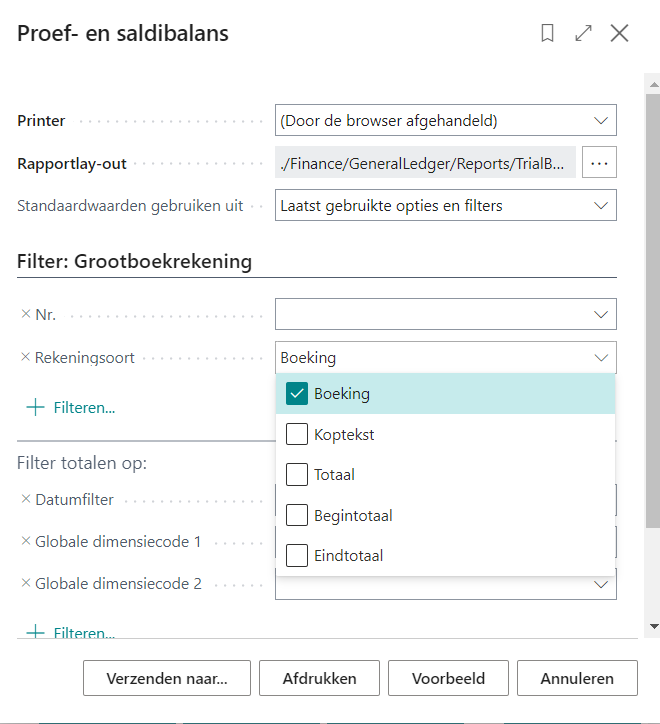 Je boekhouder zal het detail per rekening willen weten, dus kies je voor rekeningsoort 'boeking' en natuurlijk vul je de datumfilter in.